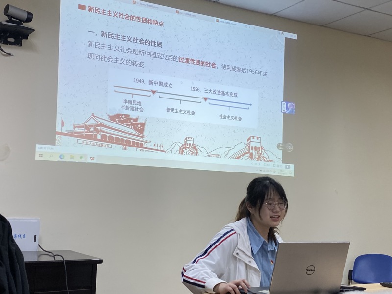 随后,鲁晓阳同志介绍了新民主主义革命的性质、特点,并总结了新民主主义革命的经验和意义。在知识竞答环节,他强调新民主主义新民主主义革命与旧民主主义革命的区别点集中表现在①新民主主义的领导者是无产阶级, ②指导思想是马克思主义。最后,刘美萱同志从“为什么要先经新民主主义社会过渡,而不直接转变为社会主义社会”这个问题出发,介绍了新民主主义社会的问题和主要矛盾,引出过渡时期总路线,并介绍三大改造的具体过程和意义,并强调1956年底社会主义改造基本完成是中国进入社会主义社会的标志。