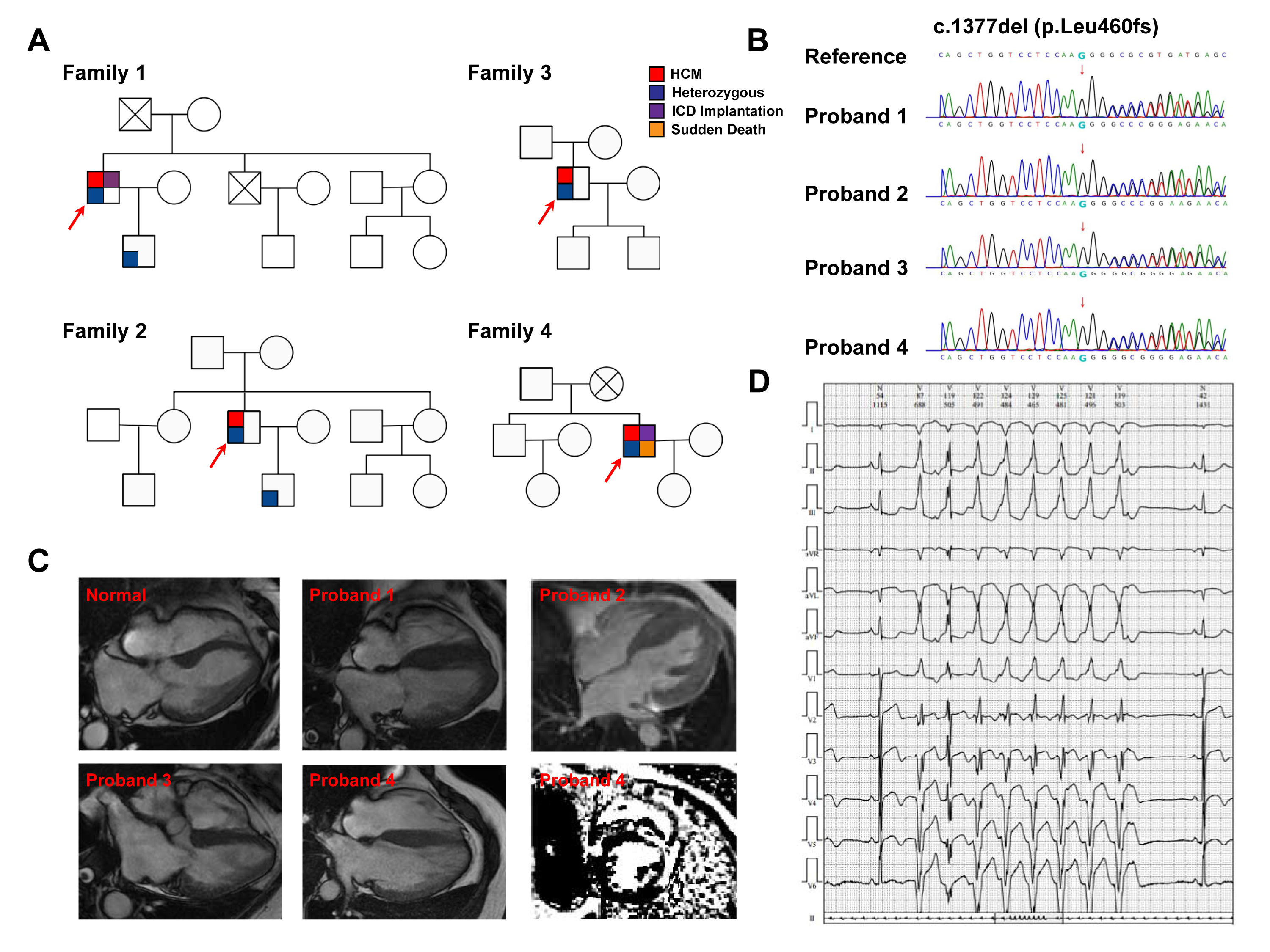 研究团队对大批的临床HCM先证者及家属开展了全外显子测序,筛查致病基因。在这个队列中,研究者发现有4个不同家系携带了同一个MYBPC3基因的缺失突变(c.1377del; p.Leu460fs)。这四个家系的先证者都存在典型的HCM症状和影像学特征。尤其是4号先证者,入组前经历过一次致死性心律失常事件,随后接受了植入型心律转复除颤器(ICD)植入和射频消融治疗。为了探究这一突变的致病性及其分子机制,团队开展了后续研究。