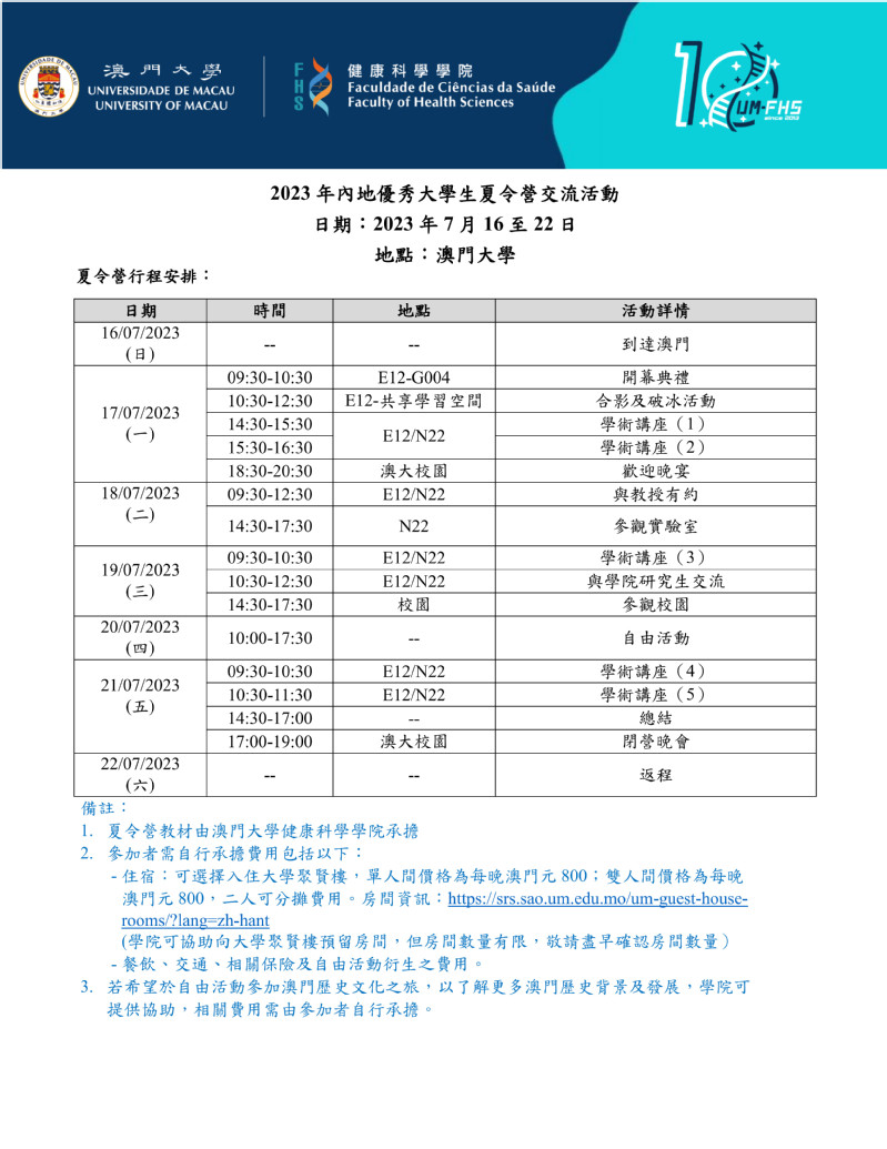 交流项目名称:(医学院)2022-2023学年澳门大学内地优秀大学生夏令营交流项目